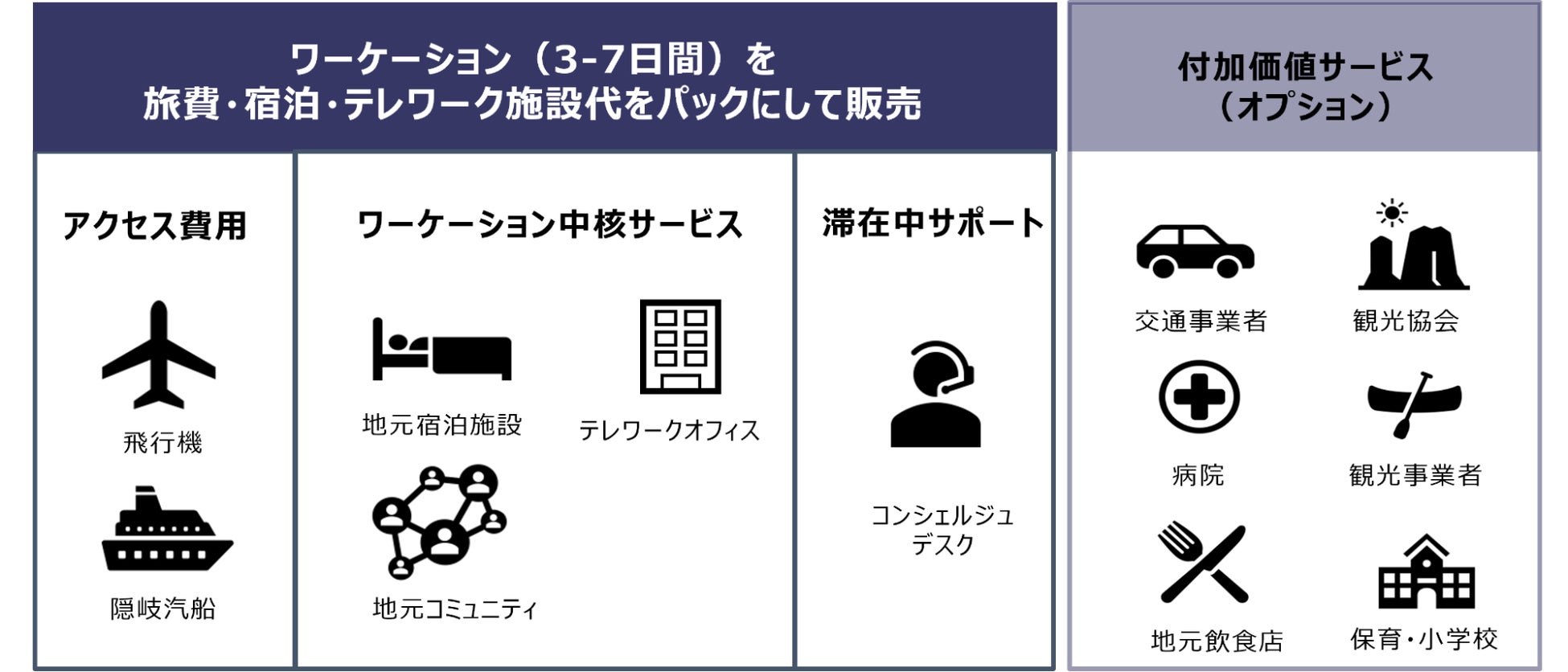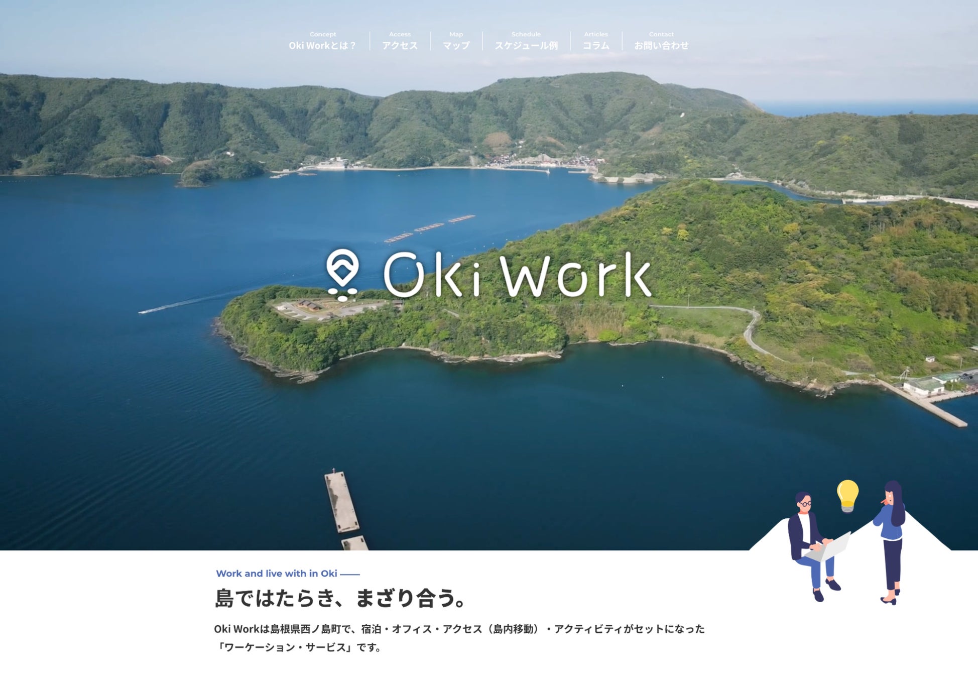 「Oki Work」とは、島根県西ノ島町で、宿泊・オフィス・アクセス(島内移動)・アクティビティがセットになった「ワーケーション・サービス」です。ワーケーション希望者は、「Oki Work」を通じて予約することができます。西ノ島までの旅費と宿泊費、テレワークオフィス使用料金を含めた中長期滞在型のパッケージを提供し、滞在中の各種予約や問い合わせについてもコンシェルジュがサポートをいたします。また、ご家族で隠岐を訪問の場合は、利用者に隠岐を楽しんでもらうため、地元保育園と提携し、平日の保育預かりサービスもオプションで設置しています。