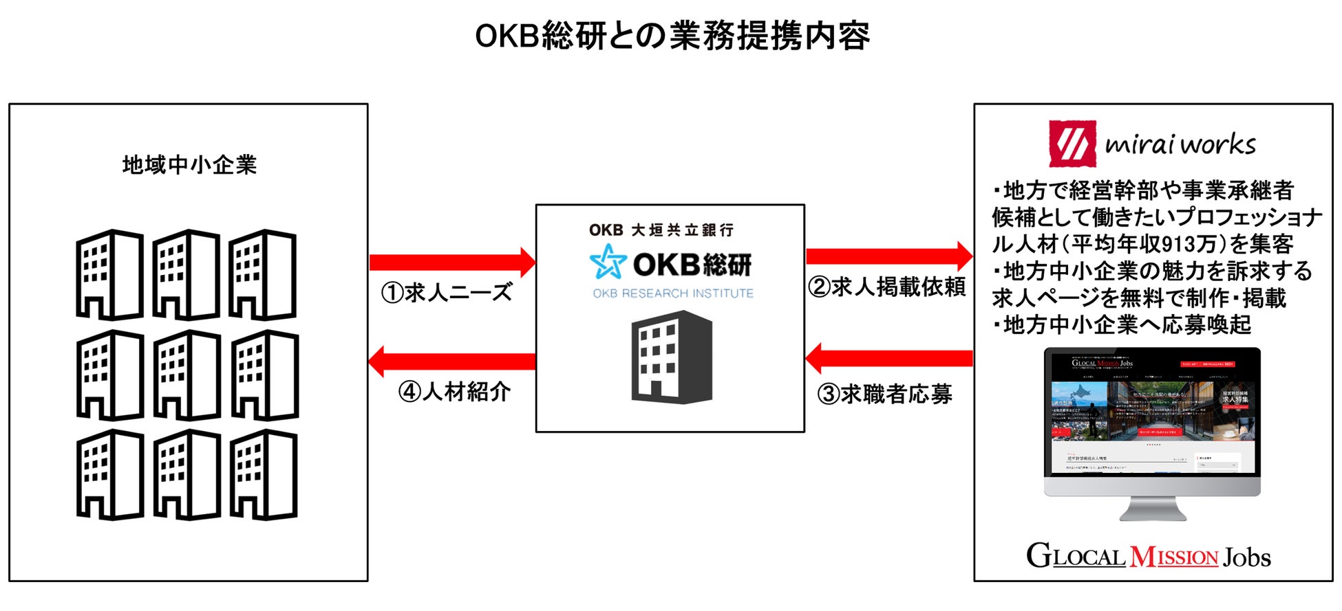 今回、地方中小企業へ経営幹部や事業承継者として転職を希望する都市部人材14,500名以上が登録する『Glocal Mission Jobs』と提携することにより、OKB総研のお取引先の人材課題解決の強化を目指します。