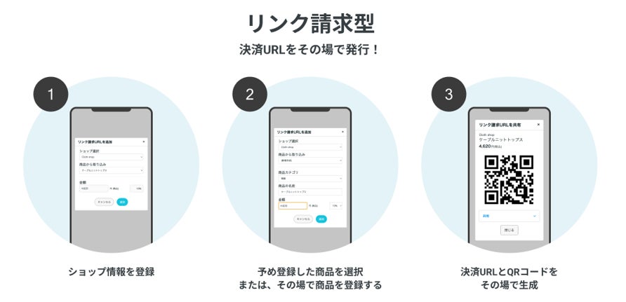 これまでの「ネットショップ型」の決済とは異なり、エンドユーザーが商品・サービスを購入するシーンやパターンに合わせてその場で商品を設定し、決済リンク(URL・QRコード)を発行できるため、カートを経由することなく即時請求・直接決済いただけます。