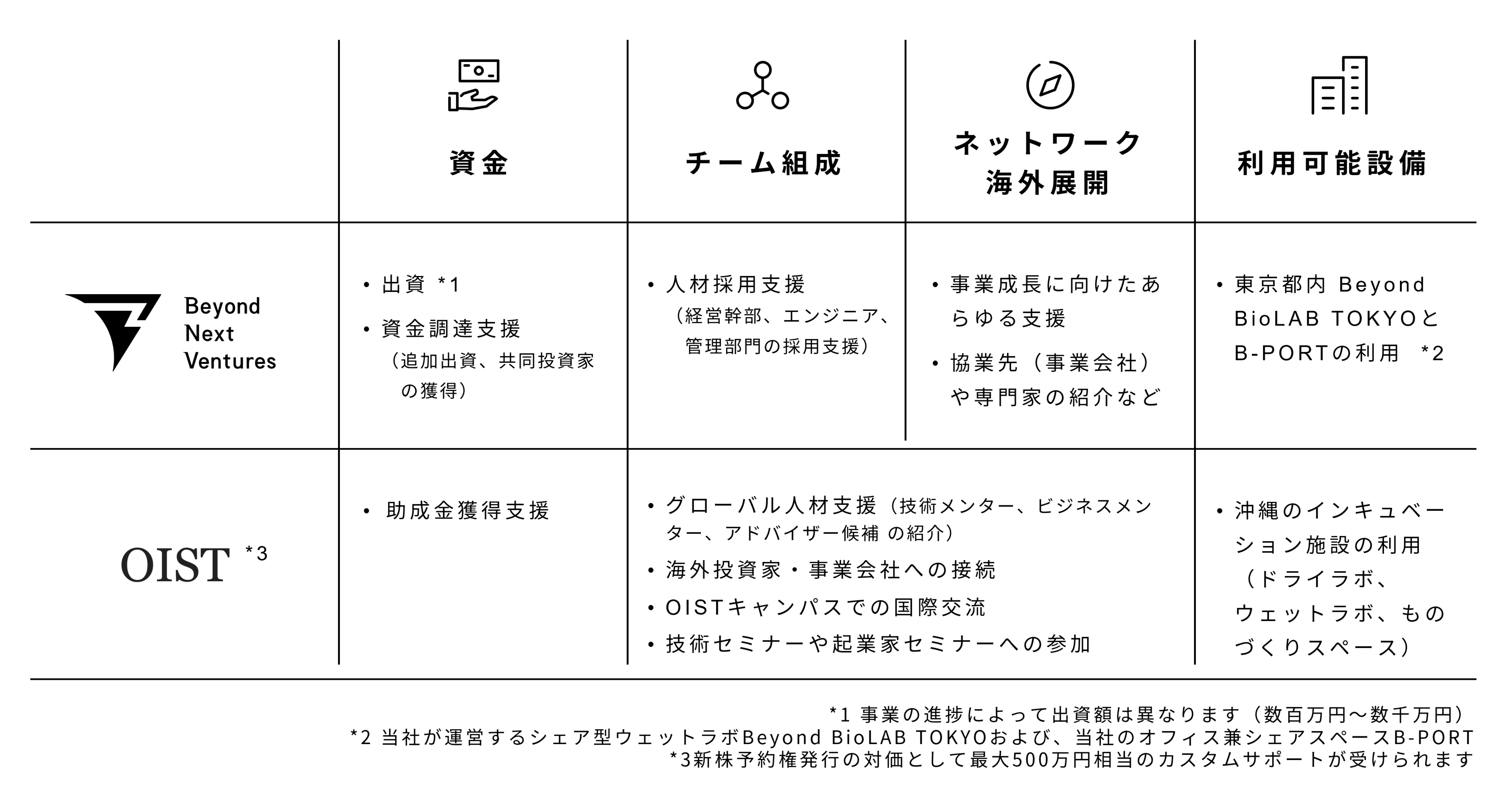 日本の科学技術分野で最も国際的に卓越した教育・研究機関であるOISTからは、グローバルな技術メンターや海外投資家・事業会社等のネットワークの提供、最先端の研究設備を整えたインキュベーション施設の利用など、グローバル展開への足掛かりとなる様々な支援を行います。