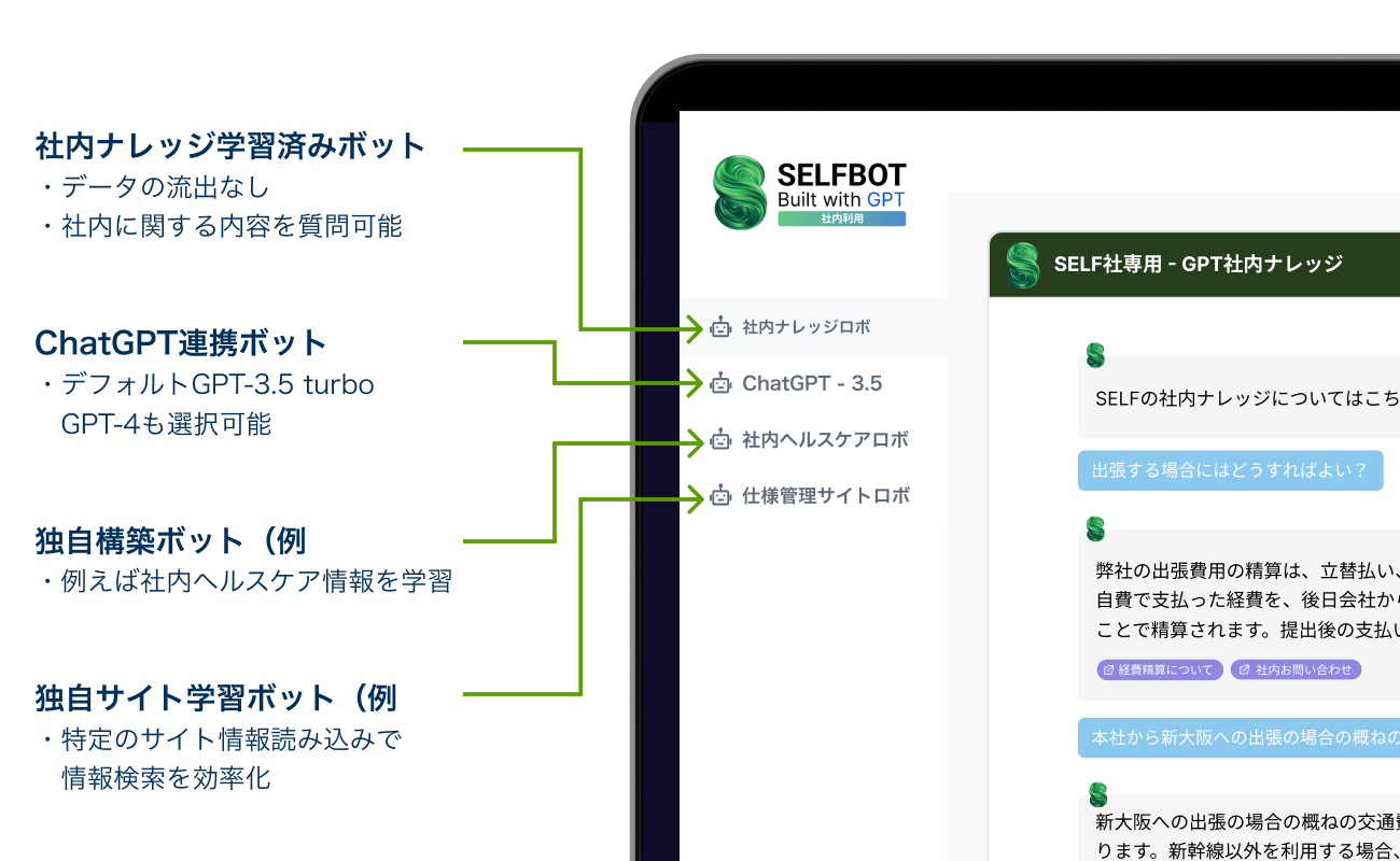 SELFBOT ひとつで、社内のデータ学習活用と、ChatGPT利用も可能となりました。