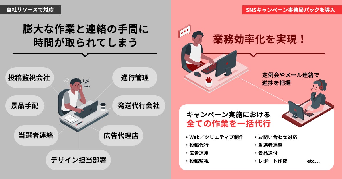 SNSキャンペーンを実施する際に、企画、進行管理、クリエイティブ制作、抽選作業、賞品の手配、お問合せ対応など、準備期間から終了まで多岐にわたる業務が発生します。事業会社のSNS担当者は大体少人数体制となり、かつ社内にノウハウがないため、自社のリソースだけでは対処しきれない状況もよく見受けられます。