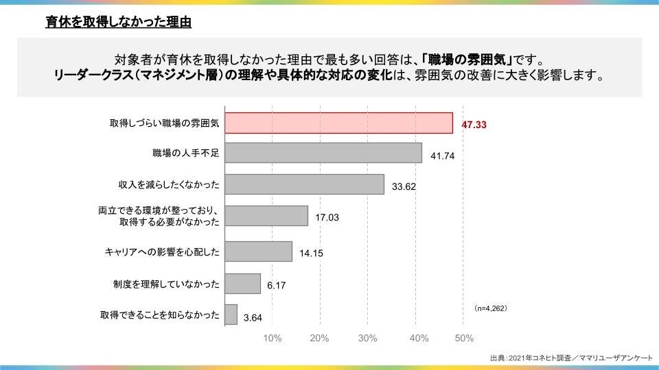 コネヒトは、安心して仕事と家族に向き合える環境をつくることを目指し、育休ガイドブックを用いた育休取得当事者向けのワークショップや、企業のマネジメント層向け研修などのプログラムをReworkパッケージとして提供しています。当社のこれまでの調査では、育休対象者でありながら取得しなかった夫の理由として最も多かった回答は、「取得しづらい職場の雰囲気」でした。マネジメント層への研修による意識変化や具体的な対応理解は、企業や組織の風土改善に大きく影響すると考えています。