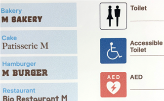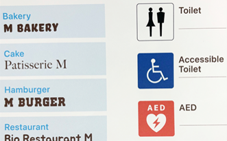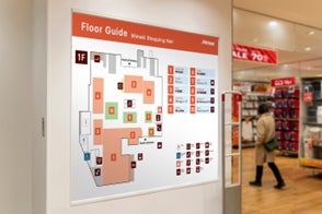 UJV200は、当社フラグシッププリンタに搭載する「330エンジン」の高密度・高精細プリントヘッドをシングルで搭載し、正確なインク吐出コントロールにより、粒状感を抑えたなめらかな人物描写と、均一でムラの無い色ベタを高い精度で再現します。肌の質感まで自然に表現する人物グラフィックから、広い面積でも美しく仕上がる色ベタまで、大型広告サイン(図1)においてデザインの意図を鮮やかかつ忠実に描き出します。さらに、細線や小さな文字もシャープに描画ができるため、商業施設の案内板など(図2)、視認性と正確性が求められる用途においても優れたパフォーマンスを発揮します。