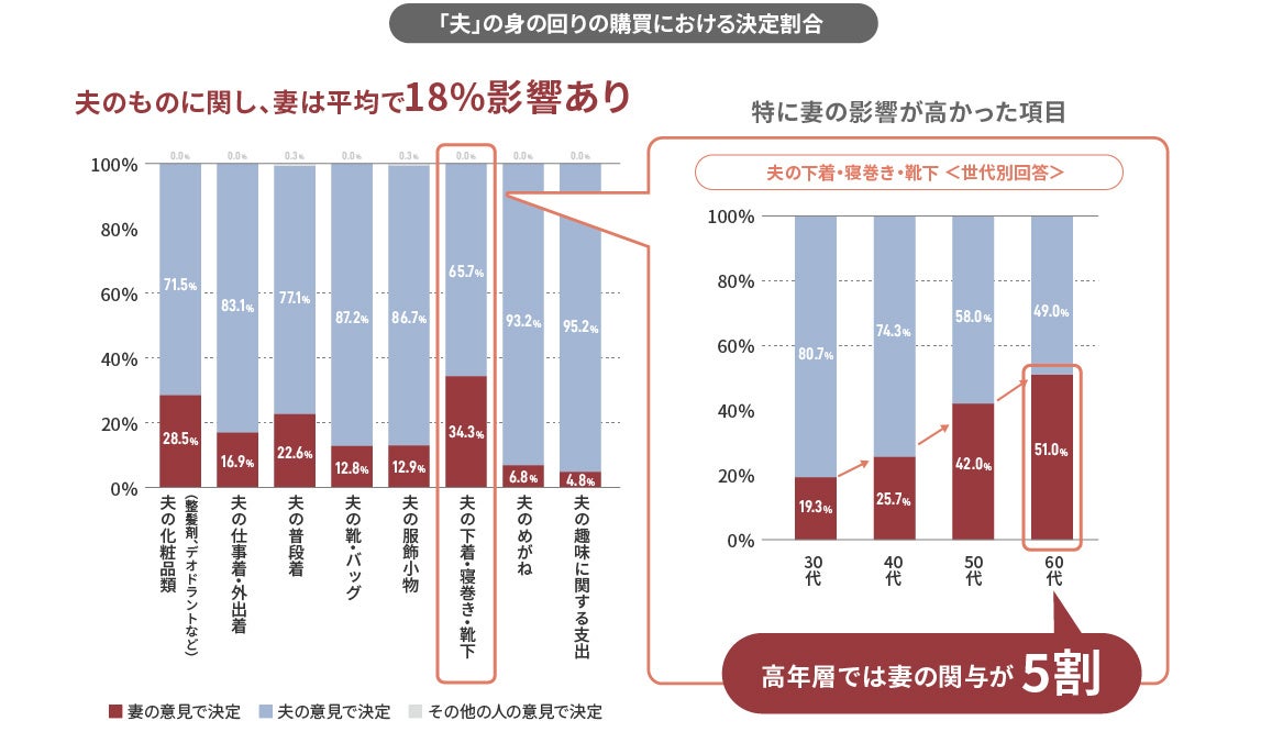 世帯の購買影響度は妻が7割!夫の「下着・寝巻き・靴下」は60代で妻の意見が半数を超える結果に
