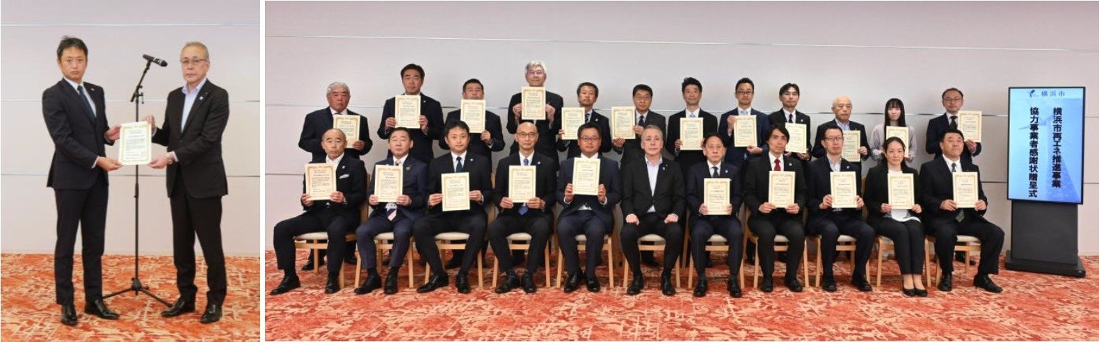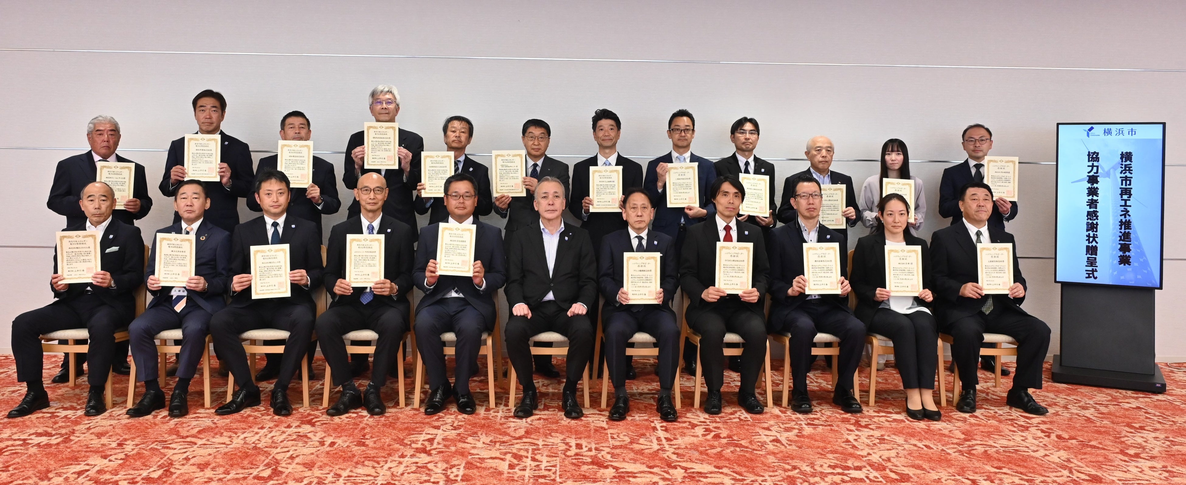 横浜市は、2050年までの脱炭素化「Zero Carbon Yokohama」の実現に向け、太陽光や風力など再生可能エネルギーの普及拡大を推進しています。市内の再エネ電気利用促進のために2024年度に実施された横浜市の再エネ推進事業のうち、再エネ電気への切り替え等を実施した事業者(市内28事業者)に対して感謝状の贈呈式を開催。贈呈式当日は、当社の代表取締役社長・岩﨑求起が出席し、横浜市の平原敏英副市長から感謝状を受贈いたしました。