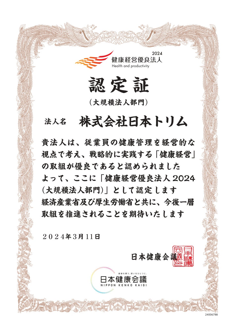日本トリムは、2020年から5年連続で「健康経営優良法人」に認定されています。今年は、「経営理念・方針」という側面における「情報開⽰・他社への普及」、「制度施策実行」という側面における「生活習慣の改善」、「評価改善」という側面における「健康診断・ストレスチェック」「課題単位・施策全体の効果検証・改善」の全4項目で業種平均を上回る評価をいただきました。