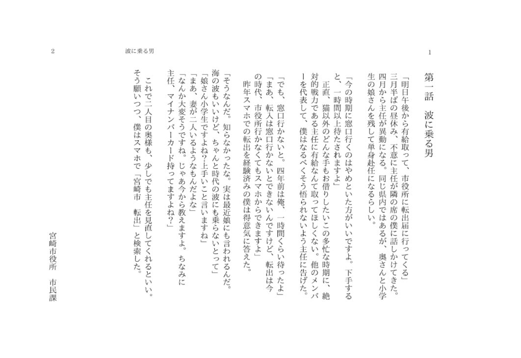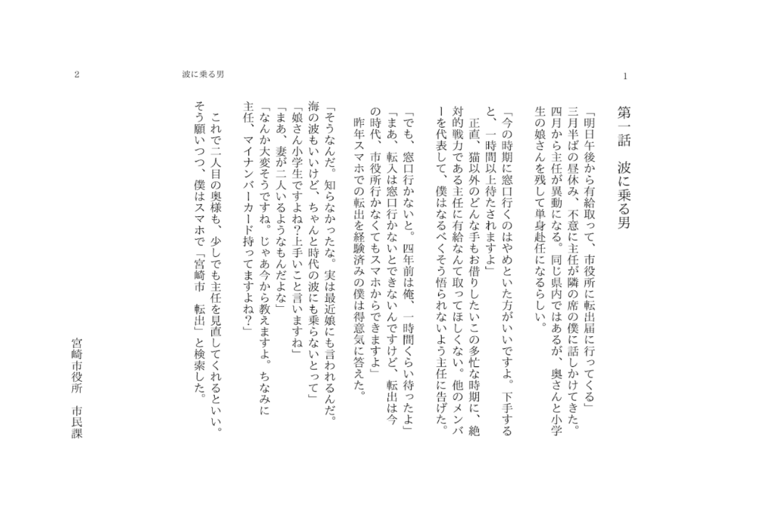 昨年1月に、NHK大河ドラマ『べらぼう』がスタート。主人公・蔦屋重三郎の「本を広告媒体として使う」という発想から考案したのが、宮崎市公式Xで読める、スマホ 転出が題材の全3話の短編小説『MOVING』です。
