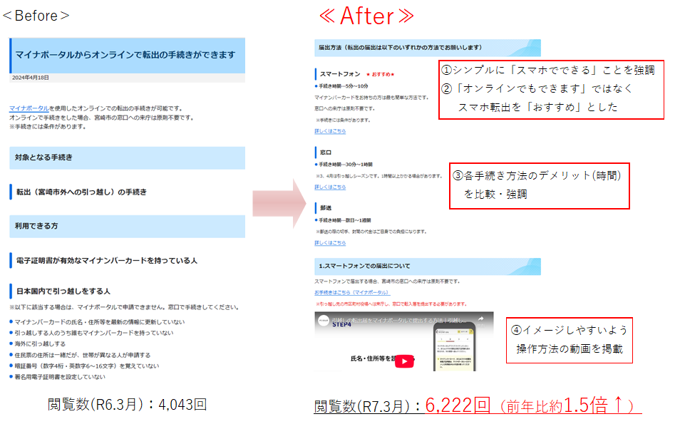 行動経済学・ナッジの手法を用いて「スマホで転出しよう!」と思っていただけるホームページを目指しました。