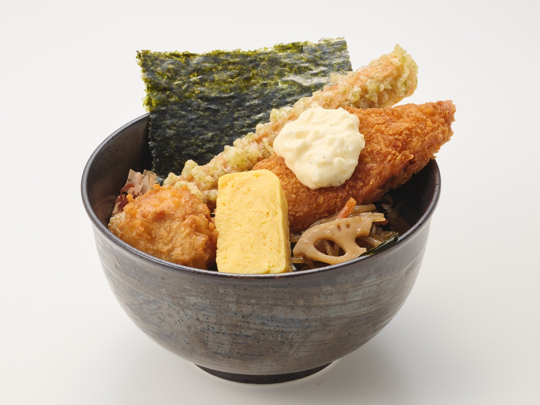 スケソウダラを使用した、ふっくらとした厚みのある白身フライに、磯の風味が広がる弾力のある、ちくわ磯辺揚げといった「のり弁当」の定番おかずを、弁当屋さんでは成しえない、丼からはみ出るくらいドーン!と盛り付けしています。