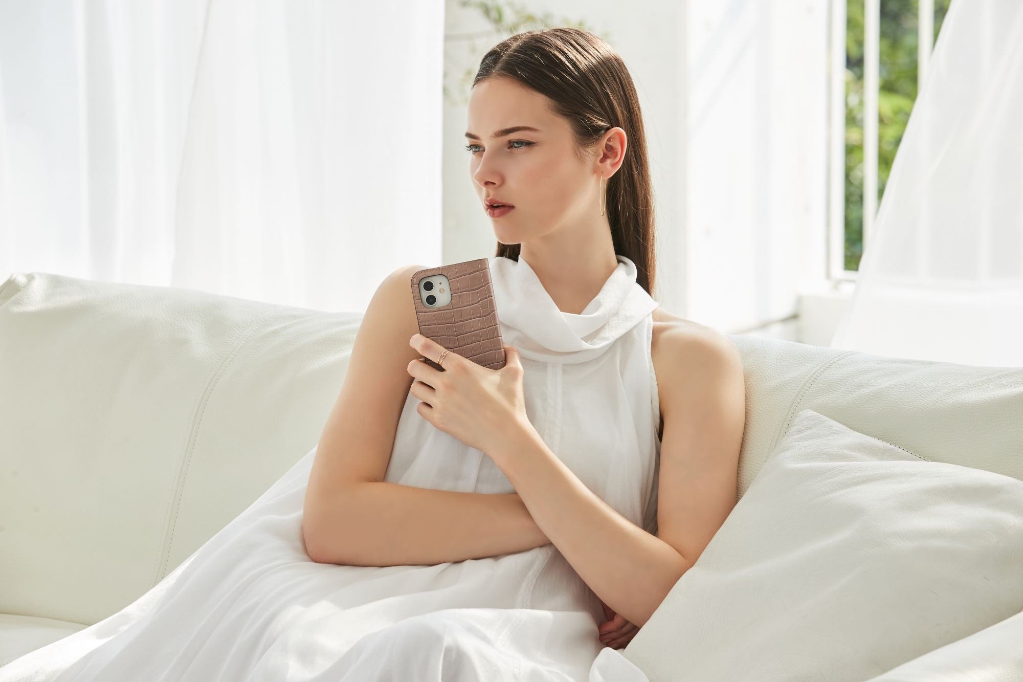 存在感のあるクロコレザーを落ち着いたカラーリングでシックにまとめたiPhoneケースは、ビジネスシーンにもぴったり。