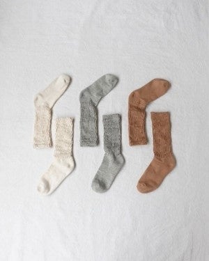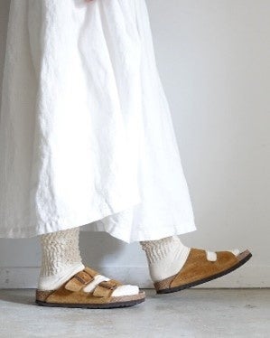 奈良県の工場で編み立てられたオリジナルリブソックス。足底はしっかりと、リブ部分は柔らかな作りで、締め付け感を抑えたストレスフリーな履き心地です。無染色のオーガニックコットンを使用し、自然な色合いと柔らかな肌触りを実現しています。
