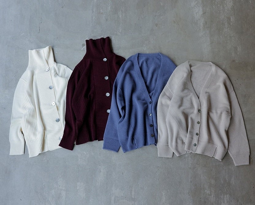 ヘアリー素材でもすっきりとした印象のプルオーバーと、衣類へ毛の付着を軽減させた、レイヤードに活躍するカーディガンの展開です。