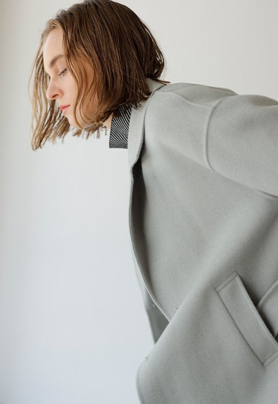 ハイクオリティーな裏地付きリバー仕立てのチェスターコート。ラ・エフでは素材のクオリティーに合わせ、特殊なミシンと手作業の工程が必要なリバー仕立ての生地を、吟味した工場で生産しています。チェスターコートの他、オーバーサイズがエレガントなショートコート、素材の良さを活かすためたっぷりと生地を使ったフーディーロングジレを展開しています。