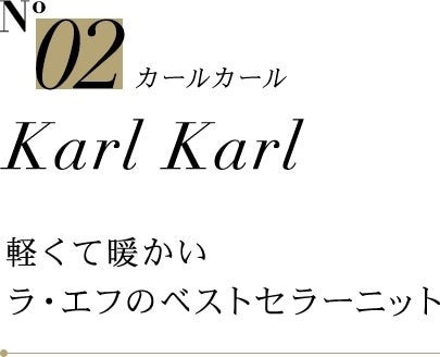 糸の内部に空気を含ませるエアリー加工を施したニット。それにより、従来のウールに比べて糸の太さは約1.5倍なのに対し、重量は約3分の2という軽さを実現しました。”軽くて、柔らかくて、暖かい”、ラ・エフのベストセラーアイテムです。