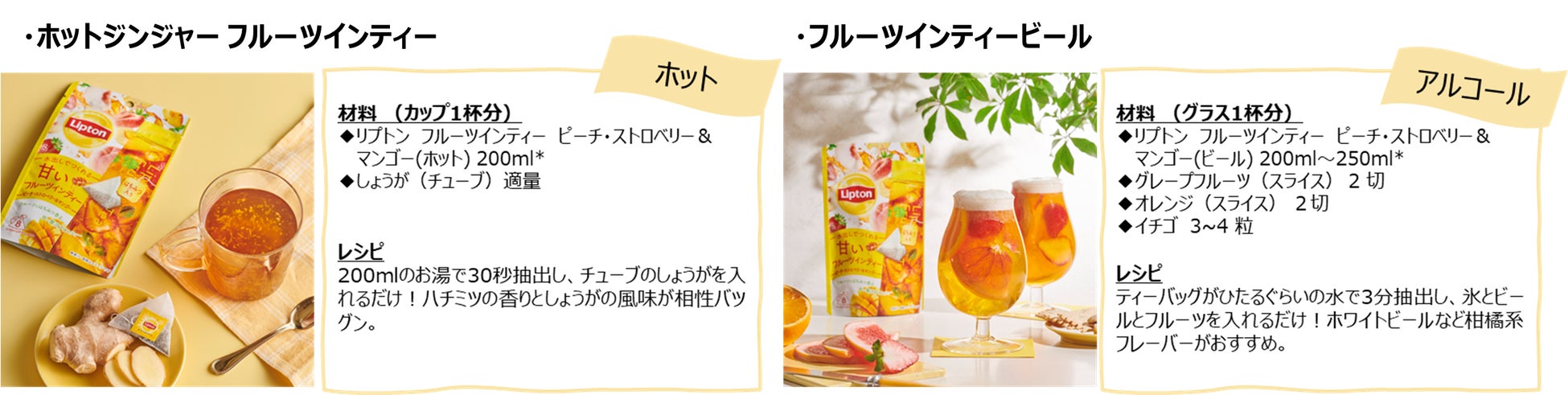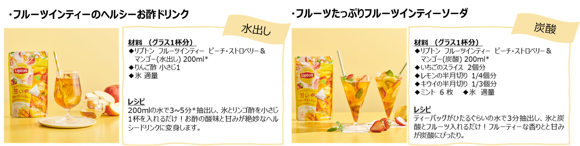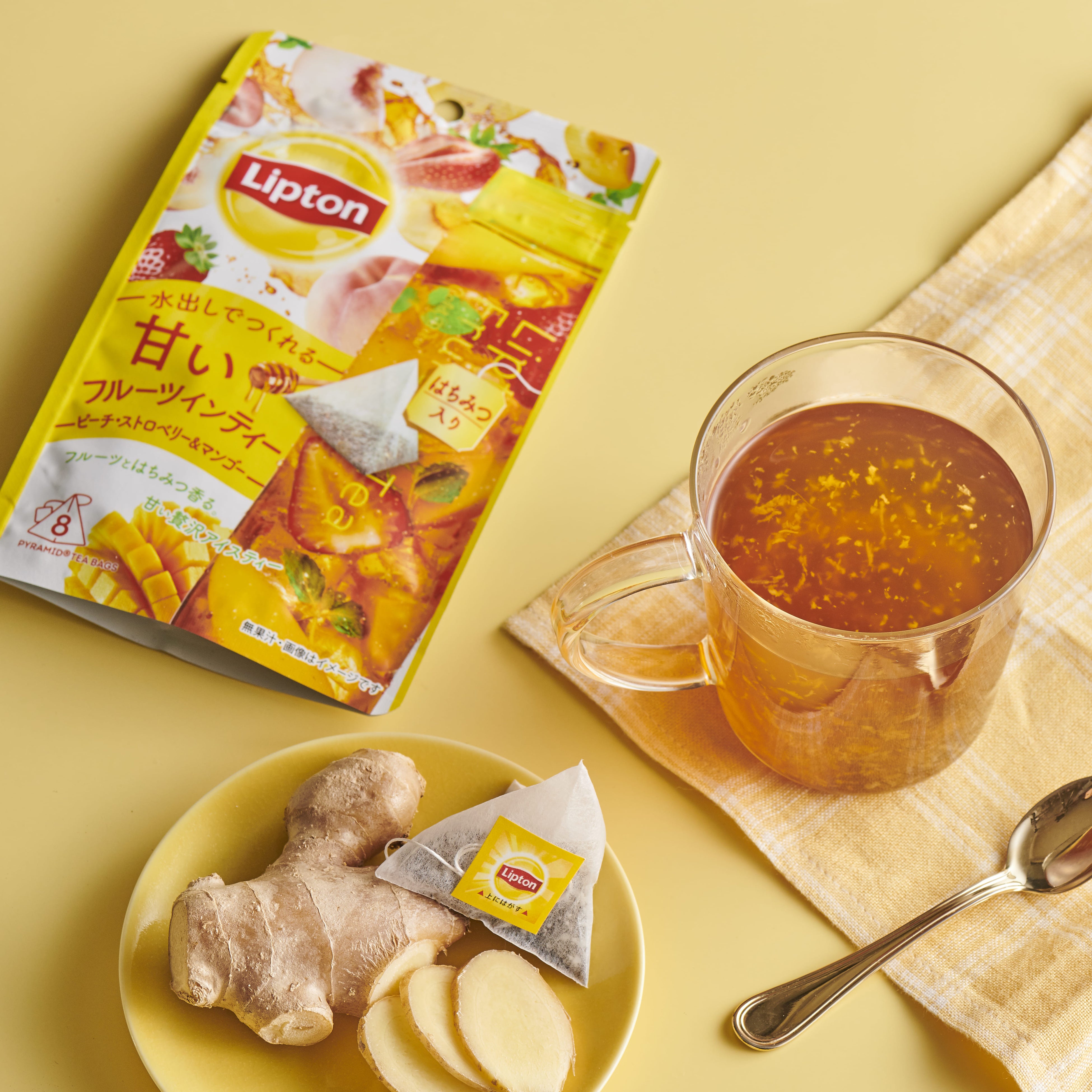 アレンジの幅がより広がった「リプトン フルーツインティー ピーチ・ストロベリー&マンゴー」は、リンゴ酢やしょうが、ビールとも相性抜群。今まで以上にシーンやシーズンを問わず、1年中味わえるようになりました。自分の好みに合わせた自由なアイデアで、大切な人とのティータイムをお楽しみください。