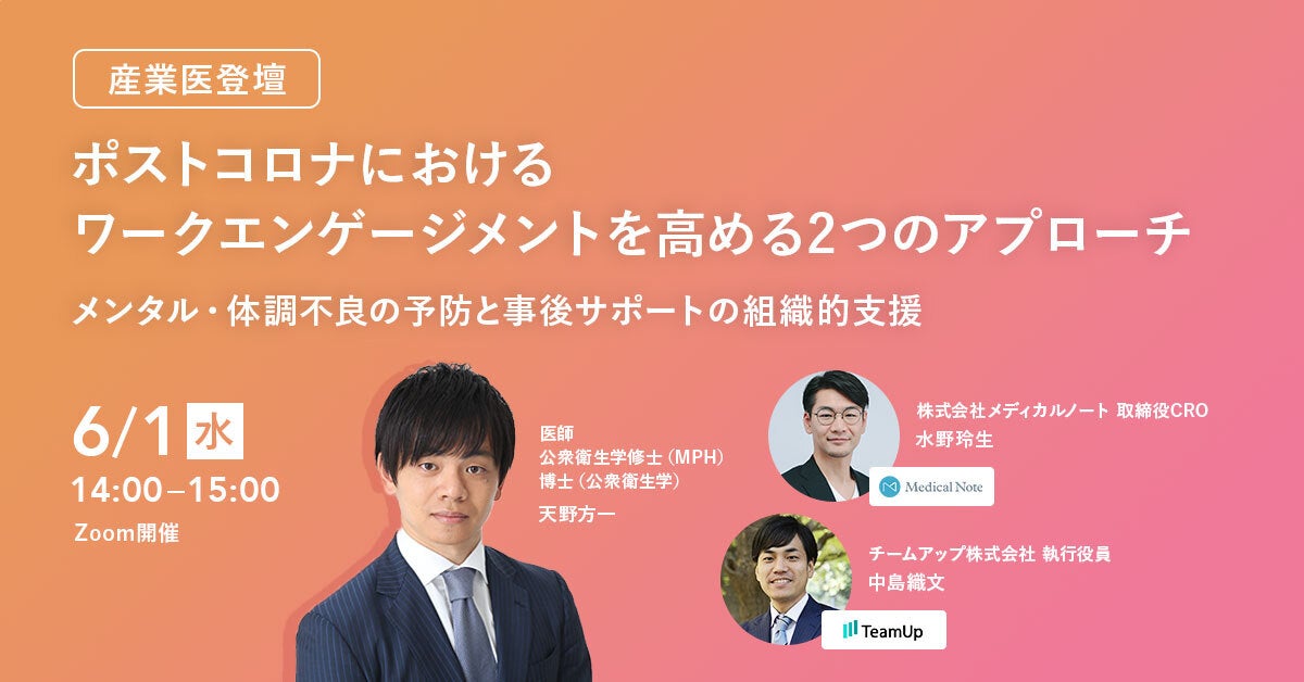 株式会社メディカルノート(東京都港区、代表取締役CEO:梅田 裕真、代表取締役:井上 祥、以下、メディカルノート)は、クラウド1on1ツール「TeamUp」を提供するチームアップ株式会社(以下、チームアップ)とともに、6月1日に「ワークエンゲージメント」をテーマとした人事担当者向けウェビナーを開催します。