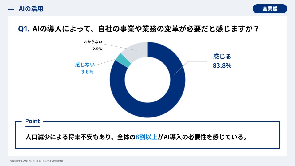 「AI導入によって業務変革が必要」と答えた企業は全体の83.8%。製造業でも同様の傾向が見られました。