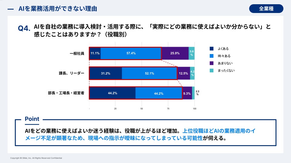 業務への適用について「どの業務に使えばよいか分からないと感じたことがある」企業は全体の約8割に達し、特に経営層や部長クラスでその傾向が顕著でした。