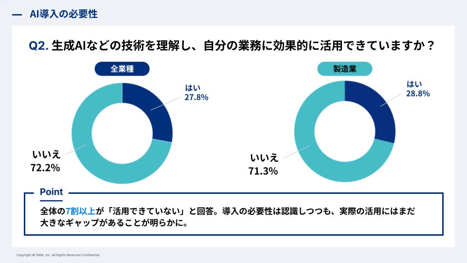 生成AIの活用状況については、全業種で72.2%、製造業でも71.3%が「業務に活用できていない」と回答。