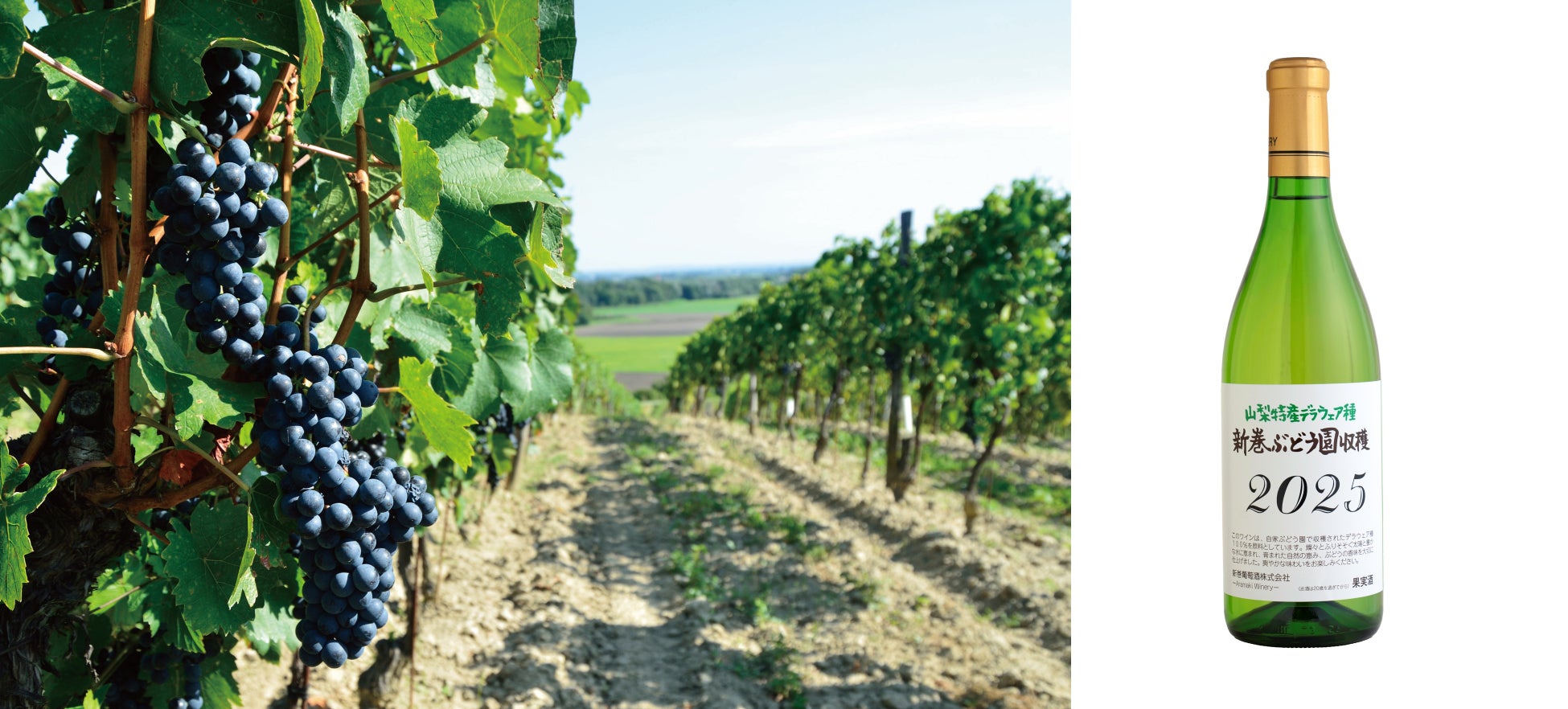 昨年10月に発売した「新巻ワイン デラウェア 2024」は、発売月の酒部門月間売上高1位※を記録。山梨県産デラウェア種100%で造る、キリっとした酸味と柑橘の香りを感じるアロマティックなワインです。本ワインは、食事と合わせて気軽に楽しめる味わいながら、ぶどう栽培から醸造まで丁寧に取り組む造り手の哲学が込められた一本。ヴィンテージごとの個性も魅力のひとつで、2025年は収穫期のぶどうの状態が非常に良く、ジューシーで厚みのある仕上がりとなりました。ピンクグレープフルーツや熟したメロンを思わせる甘いアロマに、伸びやかでみずみずしい酸味の、絶妙なバランスを楽しめます。また、山梨ではワインは地酒として親しまれており、一升瓶で楽しむ文化があります。地域ならではの文化や伝統をご体感いただけるよう、一升瓶もご用意しています。