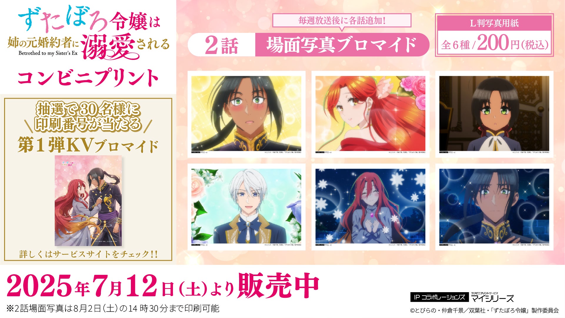 夏アニメで話題沸騰中の「ずたぼろ令嬢は姉の元婚約者に溺愛される」コンビニプリントに「場面写真」第2話が追加されました。