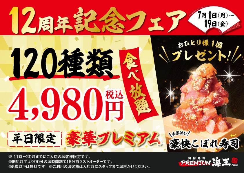 ご愛顧いただいたお客様に感謝を込めて、豪華プレミアム120種食べ放題を実施!回転寿司 PREMIUM 海王 「12周年記念祭」開催
