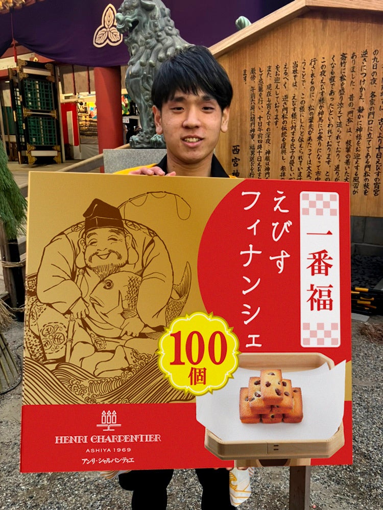 洋菓子ブランド「アンリ・シャルパンティエ」は、兵庫県・西宮神社で2024年1月10日(水)午前6時から行われる「開門神事福男選び」の走り参りにて、本殿へ早く到着した先着3名(一番福・二番福・三番福)に、2024年がさらに縁起のよい年となるよう祈念して『えびすフィナンシェ』を贈呈しました。