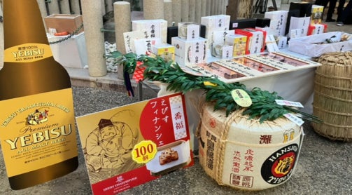 全国に約三千あるえびす宮の総本社 西宮神社は、福の神であるえびす様をお祀りしており、当社とは本社工場が近くにあるご縁があります。煮ても腹が割れないことから縁起のいい大納言小豆を使用した特別な商品である『えびすフィナンシェ』を毎月一日の旬祭(国家の安泰・皇室が益々に栄えますこと、そして皆様のご繁栄をおいのりするおまつり)に献納しております。