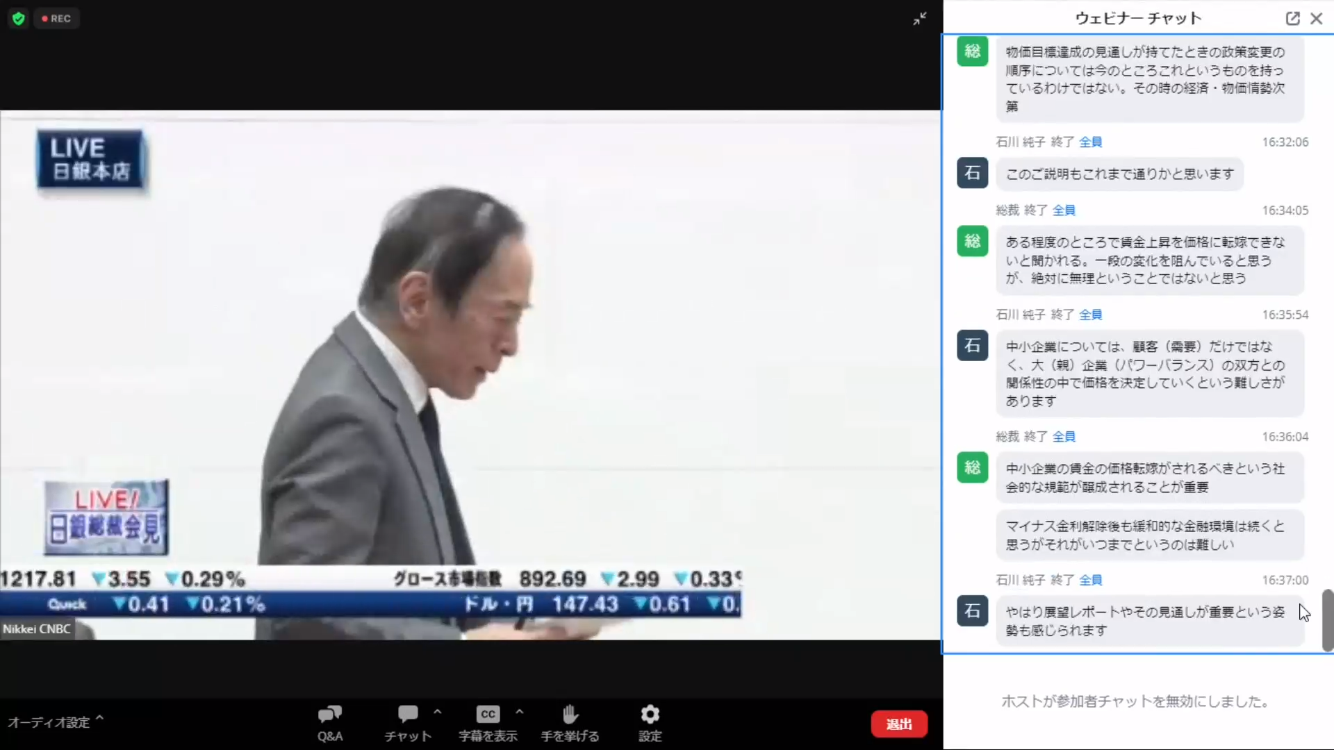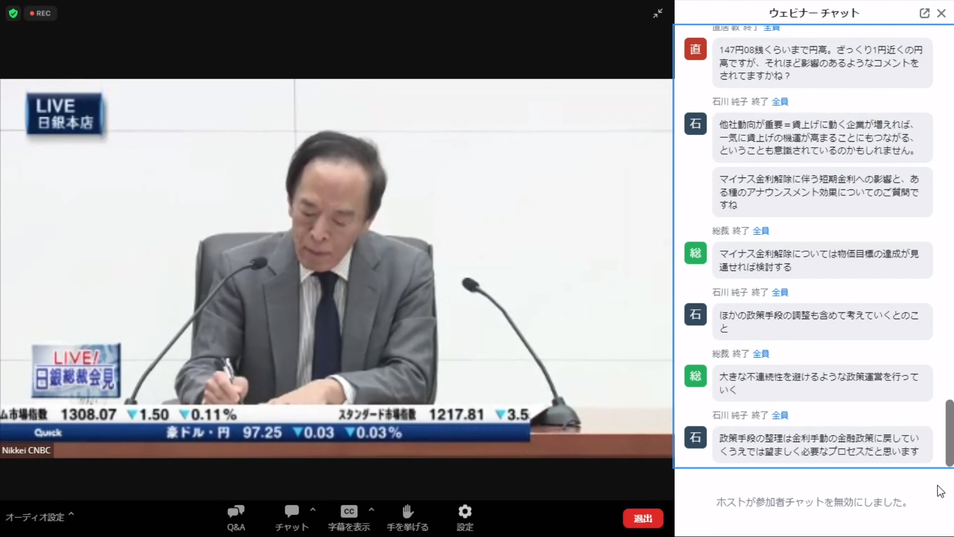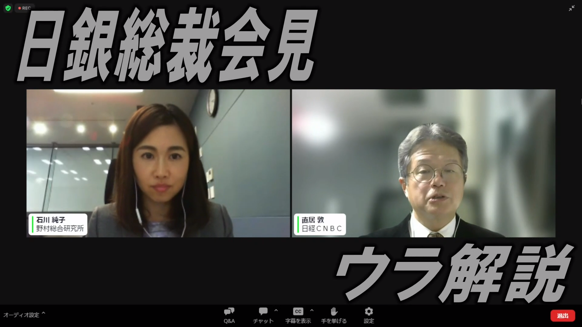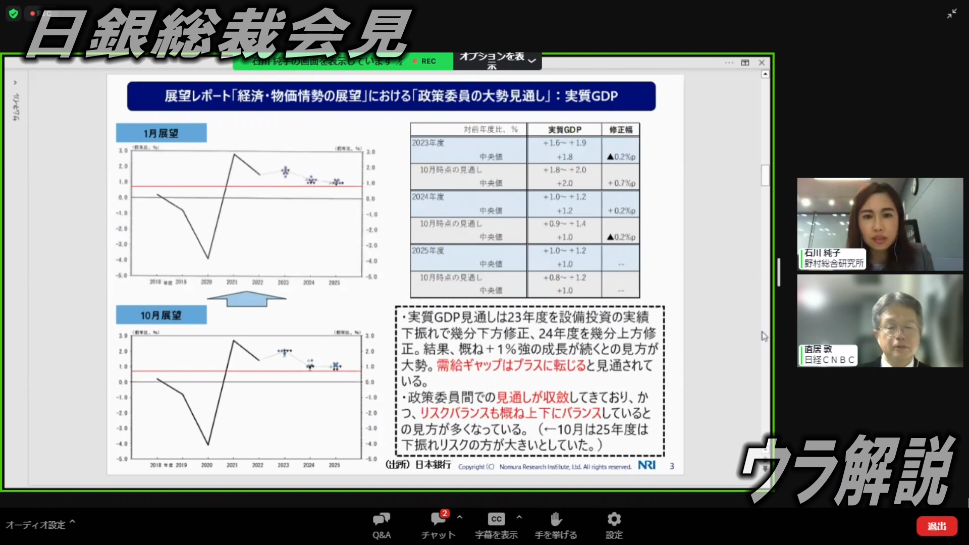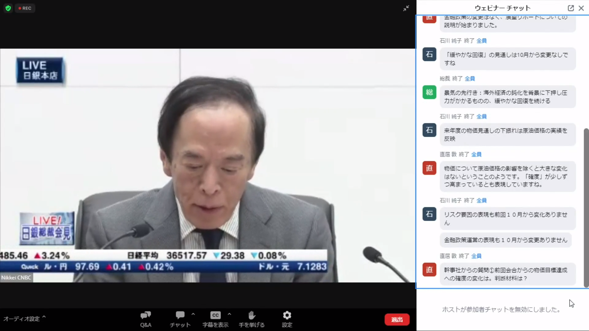 植田総裁の発言内容や記者の質問意図について、Zoomのチャット機能を使ってリアルタイムで解説。
