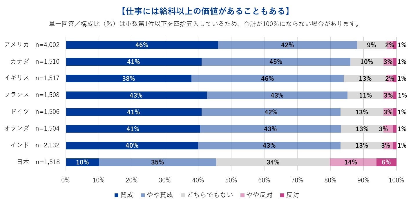 「仕事には給料以上の価値があることもある」という考えに賛成する人の割合を見ると、他7ヵ国に比べ日本が圧倒的に低いことがわかりました。賛成と回答した割合は、日本以外の7ヵ国ではいずれも40%前後であったのに対し、日本は10%にとどまります。賛成・やや賛成を合わせても、日本は45%と半数以下となり、アメリカ(88%)、カナダ(86%)、フランス(85%)、イギリス・オランダ(84%)、インド・ドイツ(83%)と比較し著しく結果となりました。