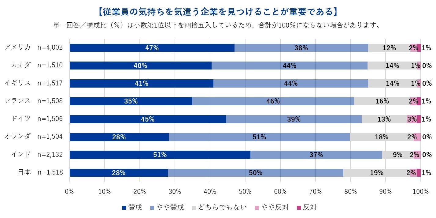 「従業員の気持ちを気遣う企業を見つけることは重要である」という考えに賛成する人の割合を見ると、8ヵ国すべてで高い水準にあることがわかりました。賛成・やや賛成を合わせた割合が多い順に、インド(88%)、アメリカ・イギリス(85%)、カナダ・ドイツ(84%)、フランス(82%)、オランダ(79%)、日本(78%)、です。