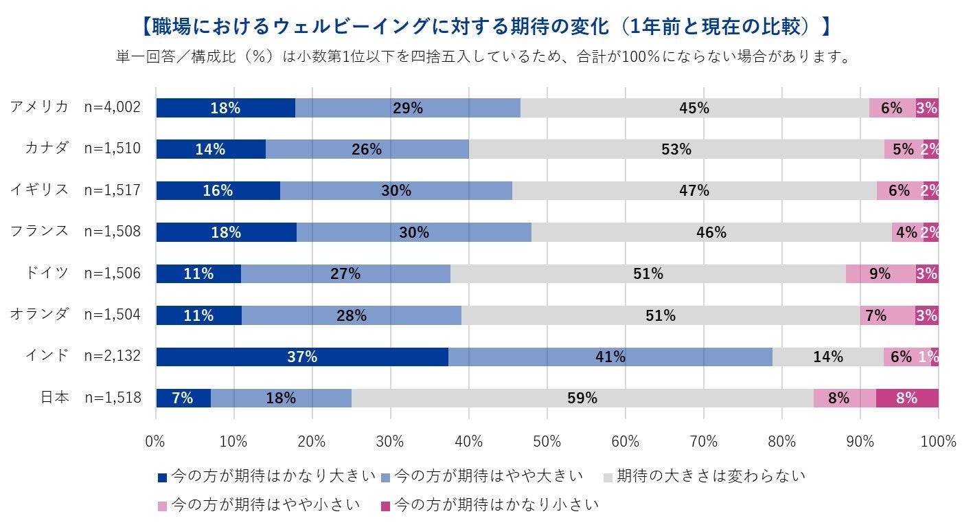 ・各国とも8割以上が、1年前と同等かそれ以上に職場におけるウェルビーイングに期待。日本の4人に1人は期待値が上昇