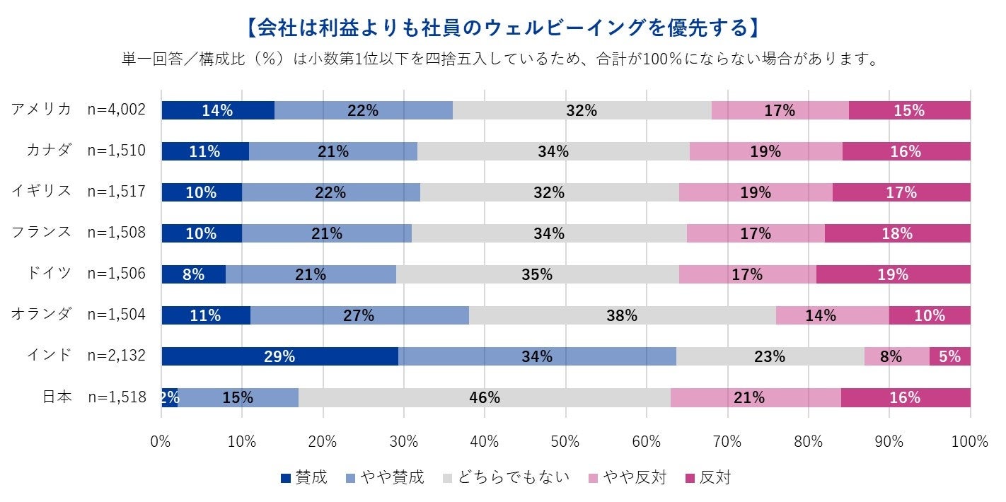 「自分の勤務先は利益よりも社員のウェルビーイングを優先する」という考えに賛成する人の割合についても、インドが著しく高い一方で、日本は顕著に低い結果となりました。賛成・やや賛成の合計割合は多い順に、インド(63%)、オランダ(38%)、アメリカ(35%)、カナダ・イギリス(32%)、フランス(31%)、ドイツ(29%)、日本(17%)です。インドは日本の約3.7倍の結果となりました。