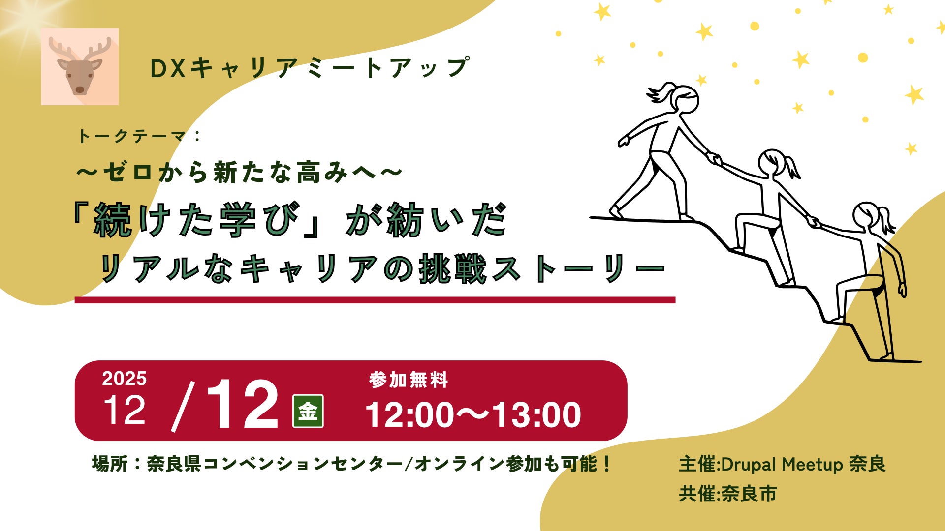 このイベントは様々な理由で働き方や生活スタイルの変化を求められるこの時代に、デジタルトランスフォーメーション(DX)に興味を持って挑戦を考えている方や新たな目標を志す方たちが一堂に会し、互いに学び合いながらDXやDrupalの力でキャリアの可能性を広げるためのミートアップです。