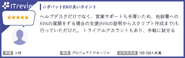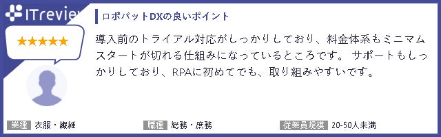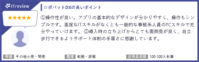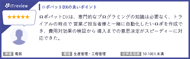 ユーザーからはRPAロボパットDXについて、次のような評価を頂きました。今後も業種や企業規模問わず、様々なお客様に活用いただき、日本型DXを推進していくサービスを提供してまいります。
