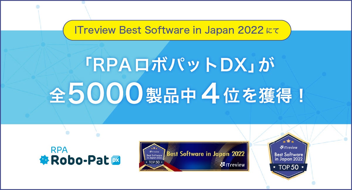 株式会社FCEプロセス&テクノロジー(東京都新宿区、代表取締役社長:永田純一郎)が提供する純国産RPA『RPA Robo-Pat DX(以下、RPAロボパットDX)』は、アイティクラウド株式会社(以下:アイティクラウド 本社:東京都港区、代表取締役社長:黒野 源太)が、この一年間で企業ユーザーからの評価が高かったIT製品(法人向けSaaSとソフトウェアを対象)Top50を発表する「ITreview Best Software in Japan 2022」において、第4位に選ばれました。「ITreview Best Software in Japan 2022」では、ITreviewに掲載される全5000製品のなかから特にユーザーの評価が高かった50製品が表彰されており、その中で『RPAロボパットDX』は第4位を獲得しました。