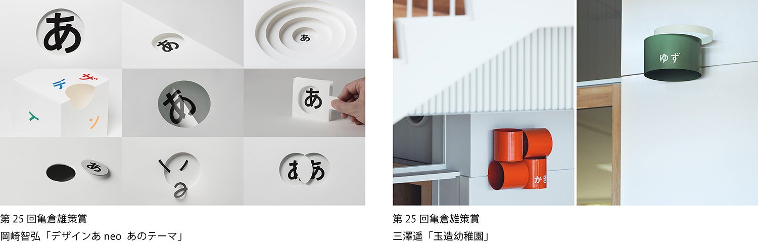 第25回となる今回は、岡崎智弘の放送局の番組コンテンツ映像「デザインあneo あのテーマ」、および三澤遥の幼稚園のサイン計画「玉造幼稚園」がそれぞれ亀倉雄策賞に選ばれました。