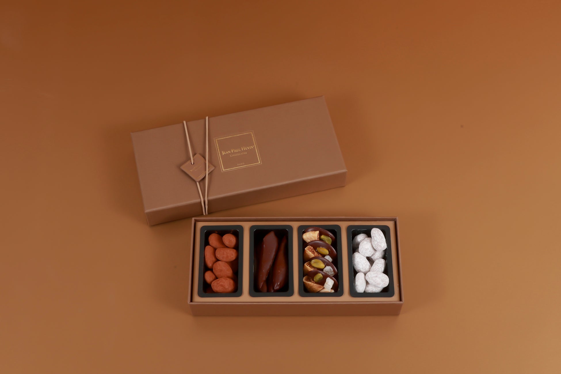 香ばしいアーモンドをチョコレートでコーティングした「アマンド」2種と「オランジェット」、「マンディアン」を詰合せ。