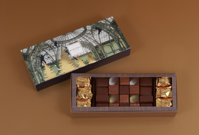 さらに、ノエル限定パッケージにも「グラン・パレ」がデザインされ、「常に最上のものをお届けしなければならない」というエヴァンの強い想いのもとクリエイションされた季節限定の「ボンボン ショコラ」や「マカロン」、「マロン グラッセ」などの詰合せもご用意しています。