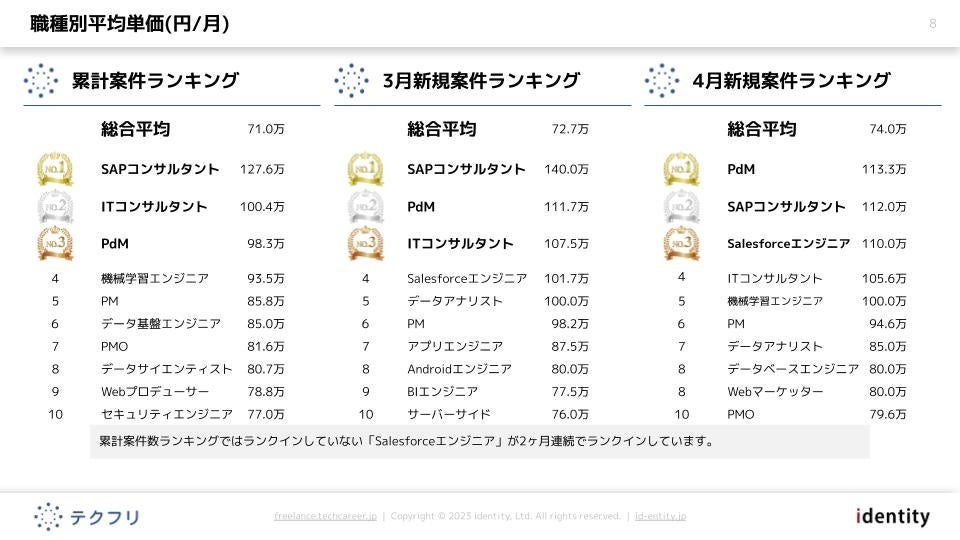 ・職種別平均単価において、累計案件数ランキングではランクインしていない「Salesforceエンジニア」が2ヶ月連続でランクインしています。