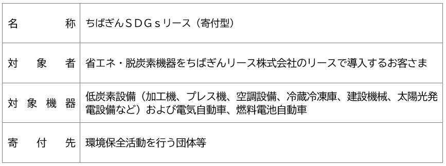本リースは、お客さまが省エネ・脱炭素機器をリースで導入する際、ちばぎんリース株式会社が環境保全活動を行う団体等へ寄付を行うことにより、地域社会の環境負荷の低減に資するものです。