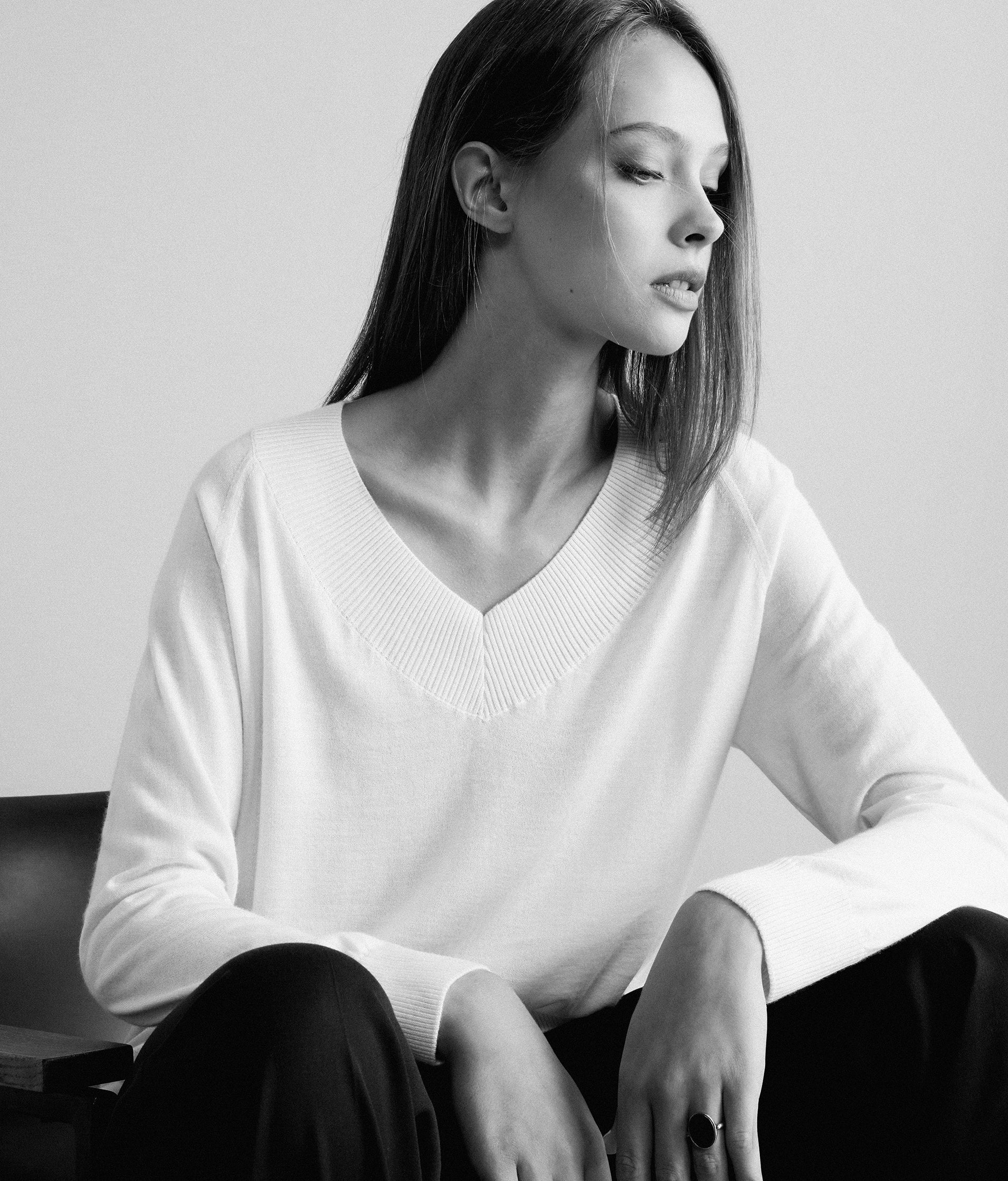 高品質の秘密の一つとして、内モンゴルとモンゴルで採取されたヤーンの中でも厳選されたものだけを使用します。東アジア地域にだけ⽣存するカシミヤ山羊の細く上質な毛を用いて生まれたアイコニックな「Ultra Fine Cashmere/ウルトラファインカシミヤ」は、2本⽷を使って作られ、軽さと滑らかな手触りと共に、保温性、弾性、通気性も兼ね備えています。また、秋冬コレクションでは、4本糸を用いた「Ultra Soft Cashmere/ウルトラソフトカシミヤ」のアイテムがベーシックな色を中心に数多く展開しています。特にベージュやホワイト、ネイビーなどベーシックカラーは、素材や後染め効果によりアイテムごとに微妙な色合いを創り出しています。