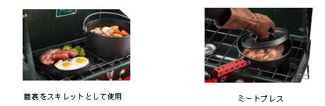 従来モデルでは真ん中が少しへこんでいた蓋裏を平にして縁をたたせることで野菜や肉、目玉焼きなどが作れるスキレットとして使用することができます。肉を焼く際のミートプレスとして活用することも可能です。