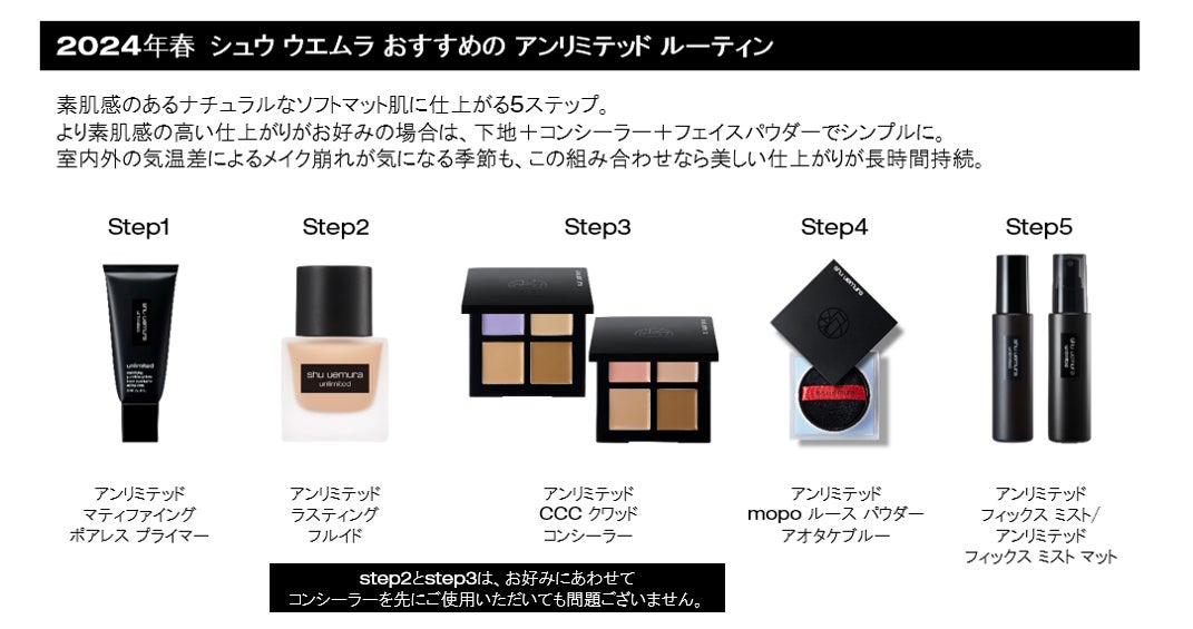 2024年春、シュウ ウエムラを代表するファンデーション「アンリミテッド ラスティング フルイド」をまとって、立体美惹きだし、毛穴レス*¹なソフトマット肌へと導く「アンリミテッド ルーティン」を完成して。