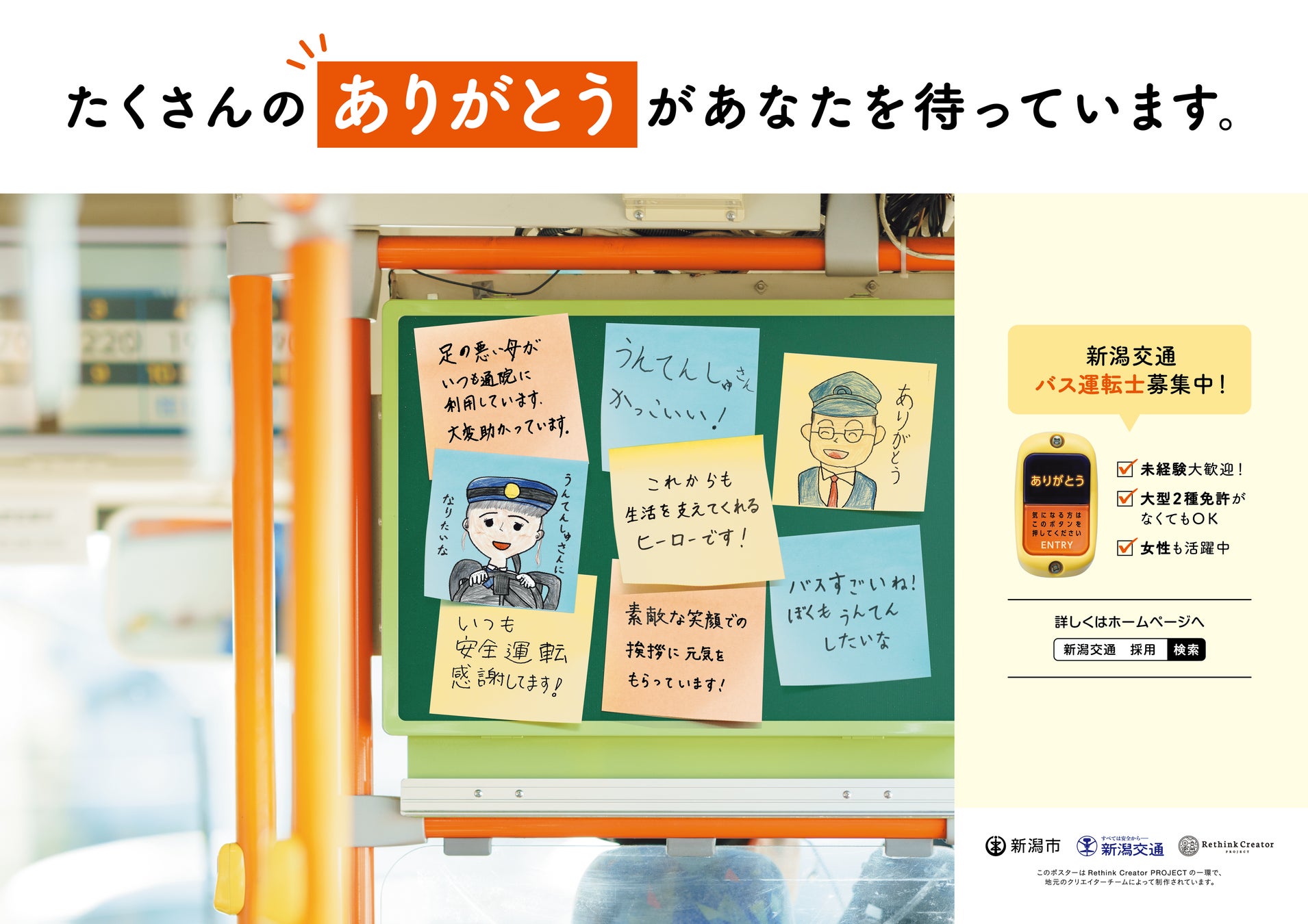 プロフェッショナル人財の育成を通じて、クリエイターに新たな働き方を提案する株式会社クリエイターズマッチ(本社:東京都港区、代表取締役:呉京樹、以下、「クリエイターズマッチ」)が主催する『Rethink Creator PROJECT』は、JTがパートナーの皆さまとともに行う地域社会への貢献活動「Rethink PROJECT」協賛のもと、2024年8月より「地域デザインファクトリー新潟」に取り組んできました。新潟市が抱える課題の解決に向け、地元クリエイターと共に「バスの利用促進」「運転士募集」を目的としたPRポスターを制作しました。