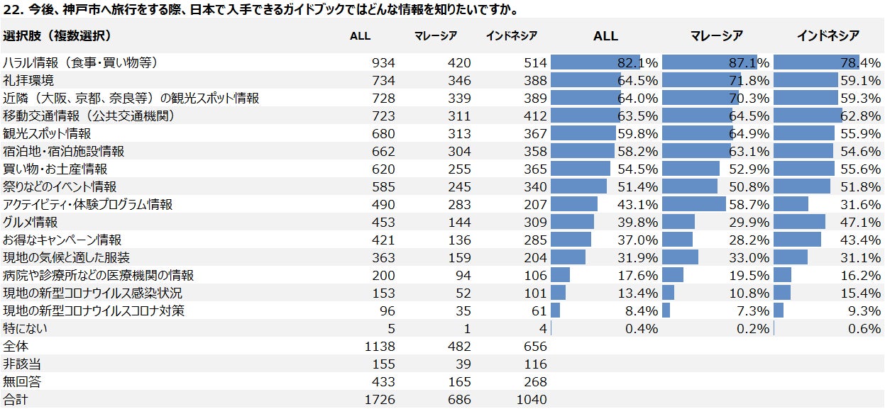 神戸を訪れるムスリムの方々に安心して観光を楽しんでいただくために、ハラルフード(イスラム教の戒律で食べることが許されている料理)を提供するレストランや礼拝場所など、ムスリム旅行者のニーズにあわせた情報を掲載しています。ほかにも、国内外に在住するムスリムにアンケート調査(※末尾参考)を行い、関心が高かった観光情報も掲載することで、神戸への訪問意欲を高めるような構成となっています。