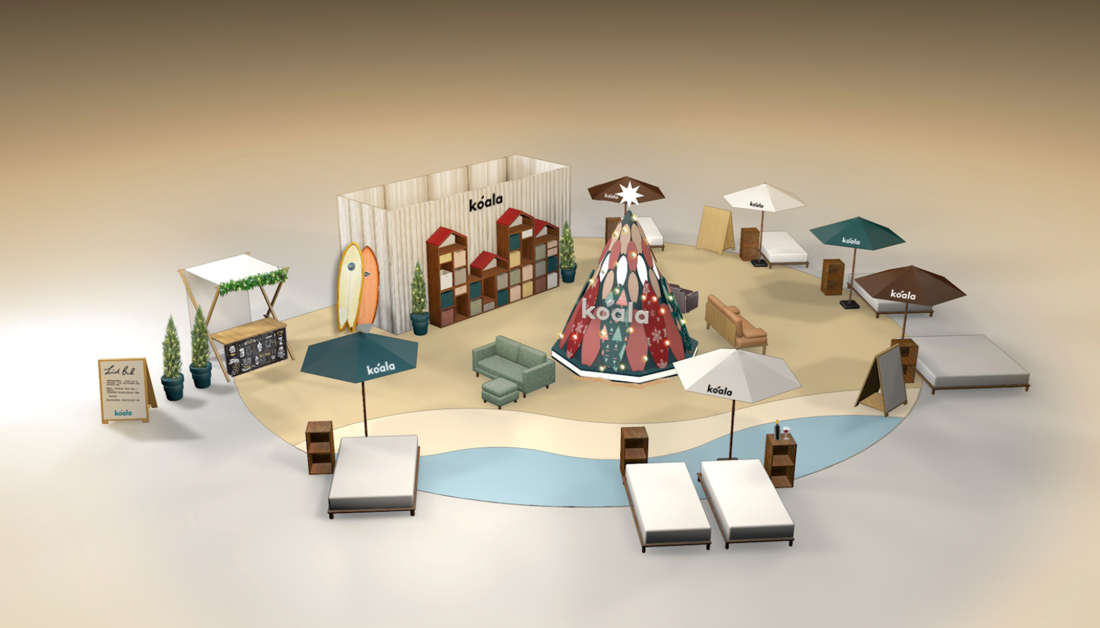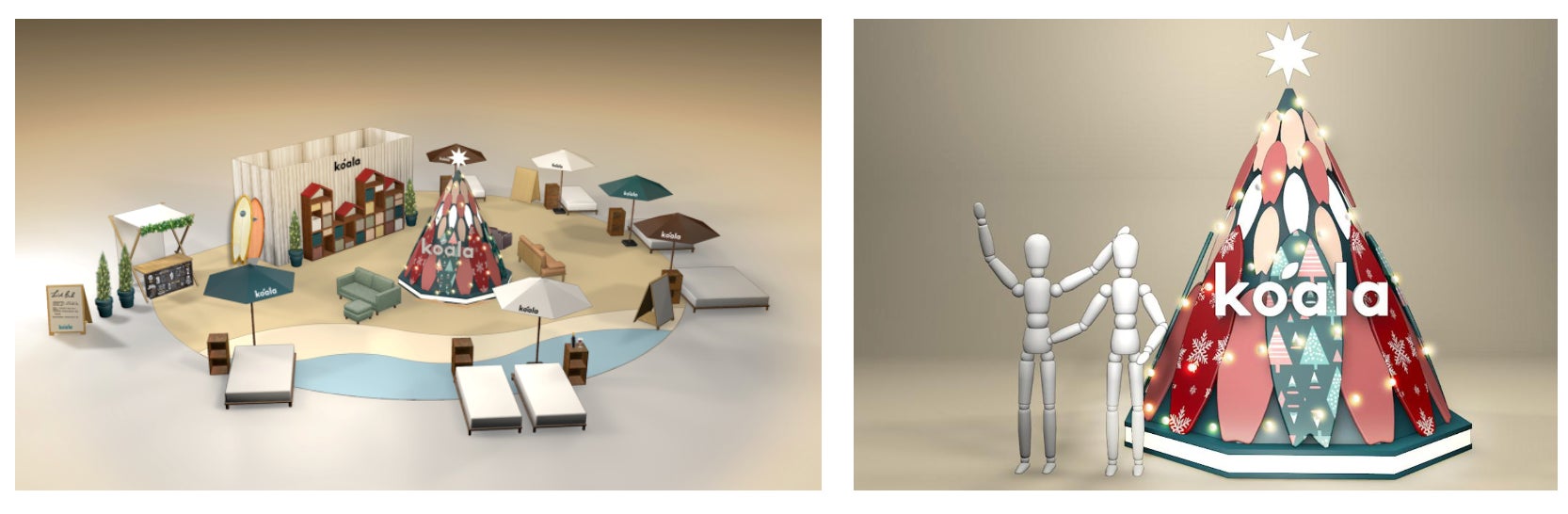 本イベント会場は、オーストラリア生まれのライフスタイルブランドならではの、砂浜やビーチハウスをモチーフにした「サマークリスマス」をテーマに展開します。会場内には、再利用のサーフボードとセンサー感知による点灯を実現した地球に優しいクリスマスツリーが登場します。再利用のサーフボードは、サーファーたちが愛用してきたサーフボードを使用し、オーストラリア人が愛するビーチカルチャーと環境配慮を表現しました。さらに、会場内に配置したマットレスに感知センサーを搭載し、訪れた方がコアラマットレスでのんびりすることによってクリスマスツリーの光が点灯する仕組みとなっております。コアラマットレスに感知センサーを施した仕組みを導入した背景に、昨今における電力高騰問題があります。コアラでは、健康な地球を創るために資金援助することを誓約し、その活動を支援、促進することをミッションとする「1% FOR THE PLANET」に賛同しており、環境保護活動を行っています。そのため、今回登場するサーフボードのクリスマスツリーは常時点灯するのではなく、人々がのんびりと過ごす時のみ全体が点灯する地球に優しいクリスマスツリーを実現しました。