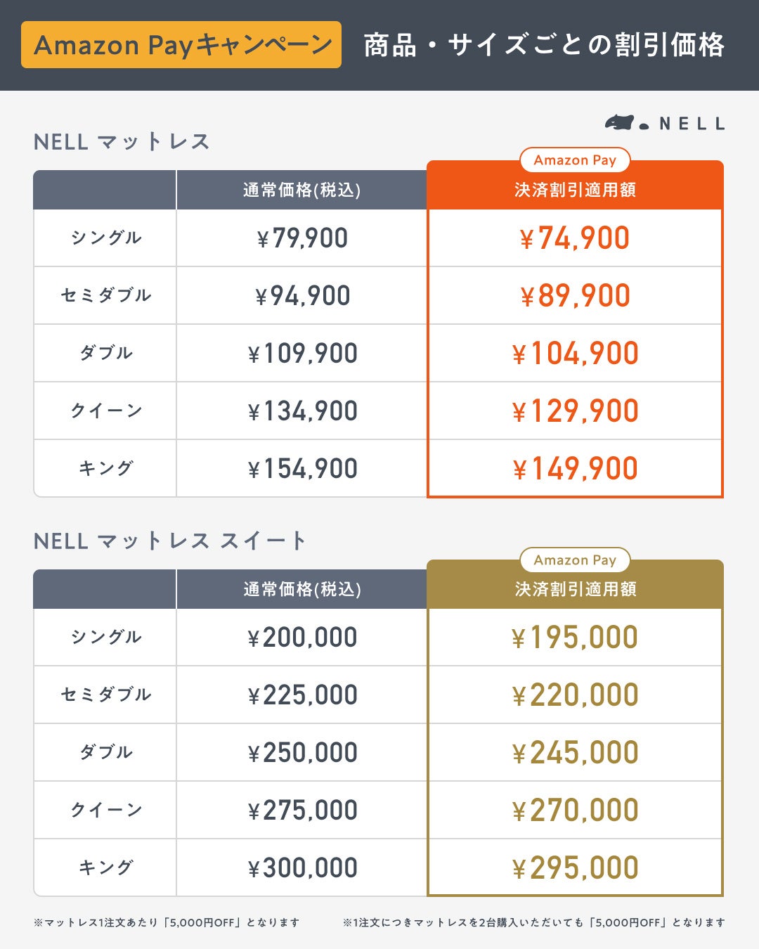 対象条件:「NELL マットレス」もしくは「NELL マットレス スイート」を1台以上含むご注文で、かつお支払い方法を「Amazon Pay」に設定
