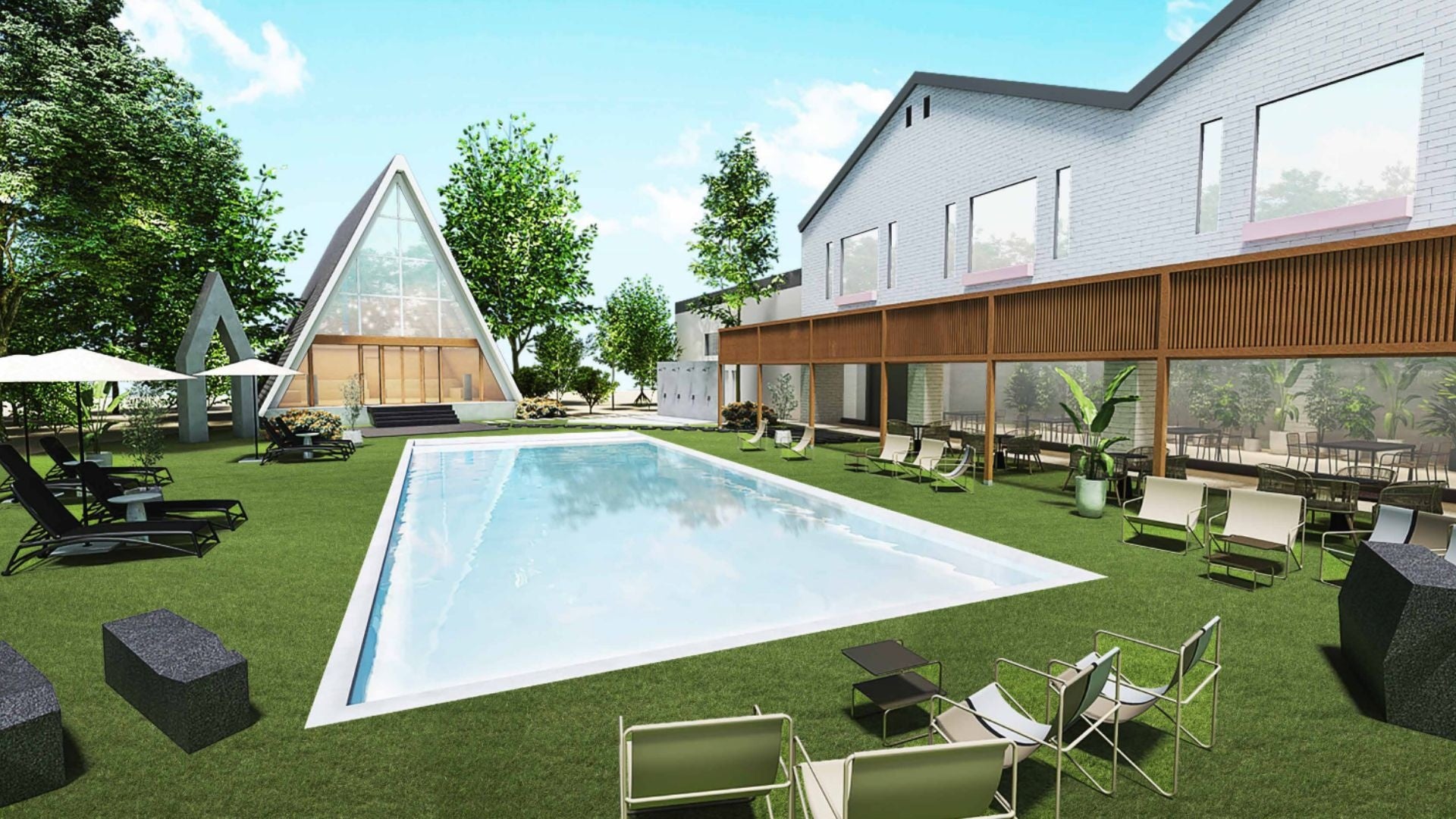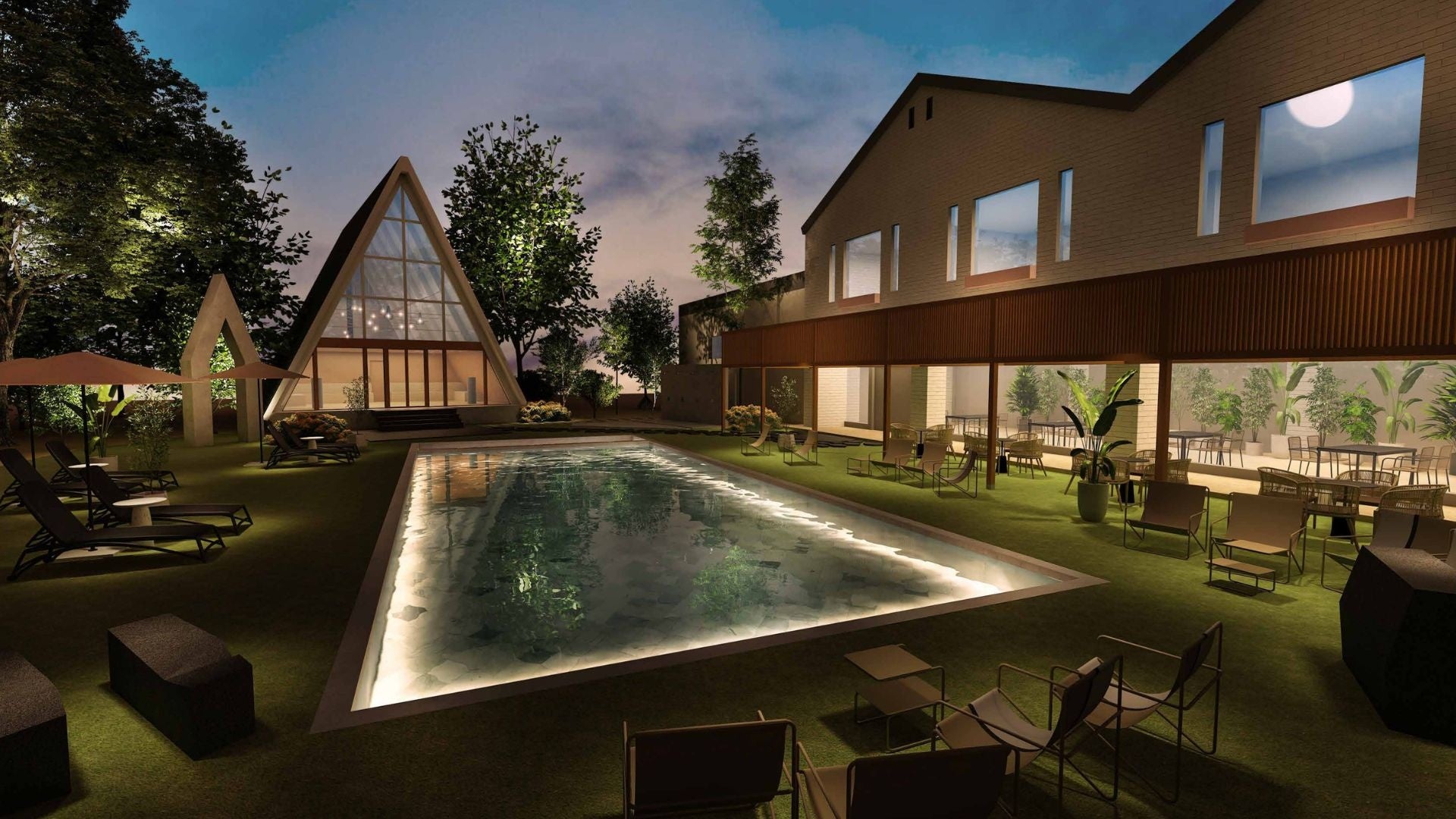 木々に囲まれた中庭には、瀬戸内海を象徴するメタファーとしての水盤を中心に、木々に囲まれた水辺のほとりに集う、ヨーロッパの中庭・パティオを彷彿とさせる非日常感を演出。宿泊中にアウトドア体験を楽しめる滞在場所へとリノベーションします。